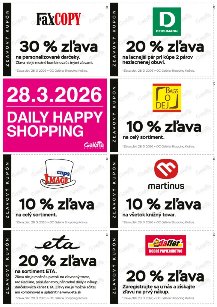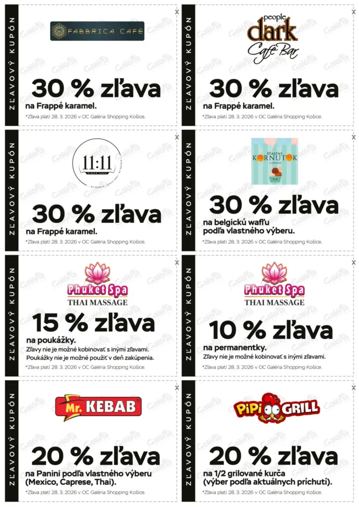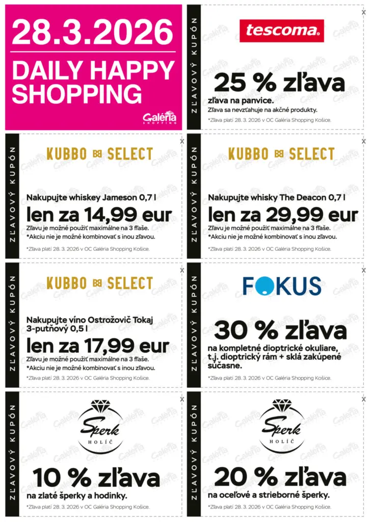 Dňa 28. 3. 2026 budete môcť využiť pomôcou zľavových kupónov zaujímavé akcie, ktoré nájdete v časopise ACTUAL GALERIA ( v priestoroch OC Galéria) alebo na našom webe.